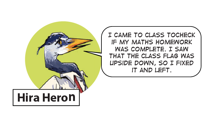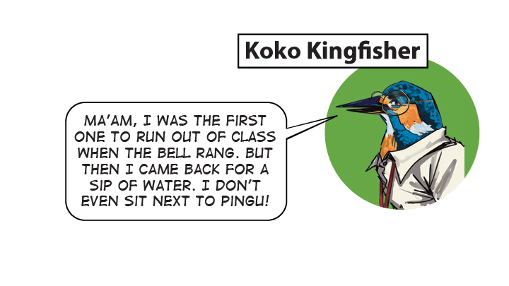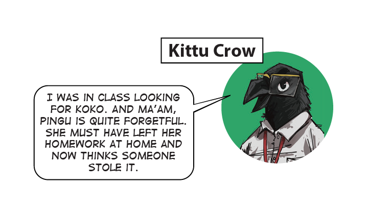 She called Koko Kingsher, Hira Heron and Kittu Crow to the classroom. “You three were the last to leave class when the lunch bell rang. Do you know anything about Pingu’s missing homework?” she asked sternly.