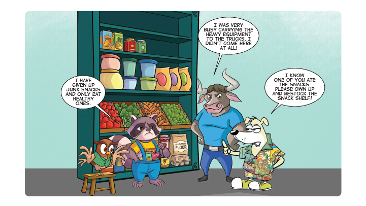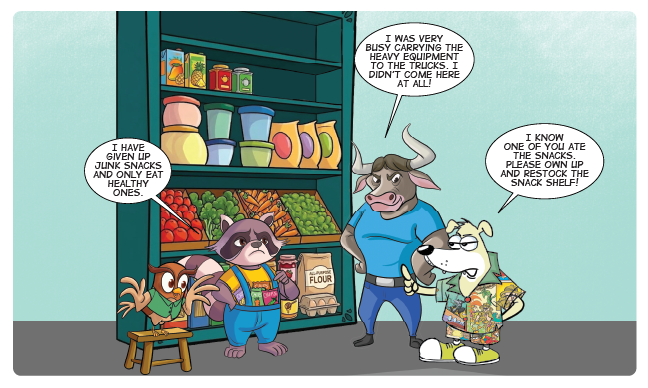 Teary-eyed Assistant Camera Operator Hooty Owl was just getting off the ground. “We’ve been robbed! The snacks have disappeared from the top shelf!” she cried. Kooki looked up at the empty snacks shelf in surprise. “I thought I heard some noise here. But when I came to check, someone pushed me down. I only managed to see a flash of blue as I fell,” said Hooty Owl.