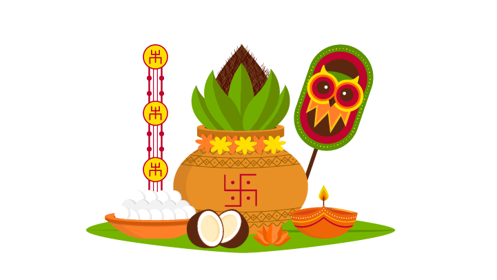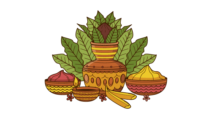 Puthandu: This festival is celebrated on the first day of Chitterai, the first month of the Tamil calendar. Families begin the day by waking up to kani, the first sight of the year, that consists of flowers, fruits, gold, silver and a mirror that brings good luck. Houses spot kolams—intricate patterns drawn on the floor using rice flour near entrances. In certain parts of Tamil Nadu, children receive cash from elders. An elaborate meal consisting of dishes such as mango pachadi (a sweet mango chutney), pongal (porridge-like dish made of rice and lentils), vadai (fried snack made of lentils), sambar (dal-based vegetable curry) , sadam (rice), payasam (milk-based dessert), vegetable curry, fresh mango pickle and curd is enjoyed on this day. Families also sing devotional songs to invite prosperity and happiness into their homes.