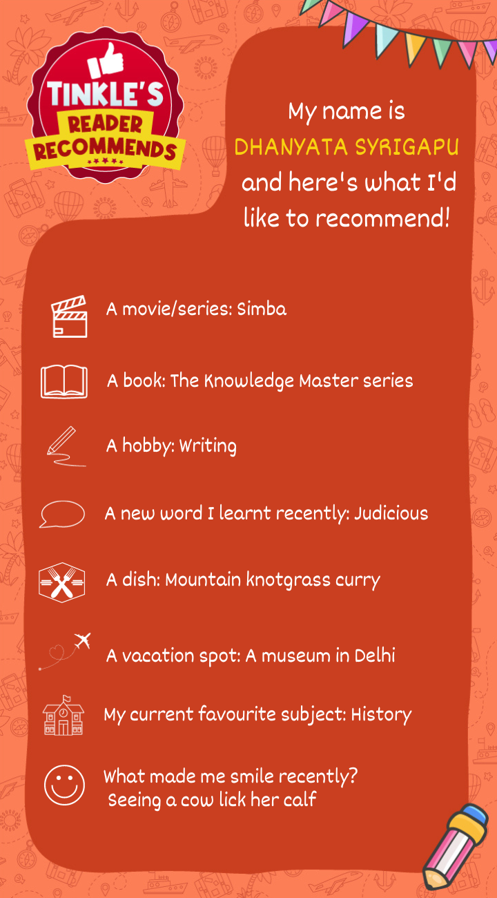 Tinkle reader Dhanyata Syrigapu has some interesting recommendations for you! Find out her favourite book, movie, hobby and more!