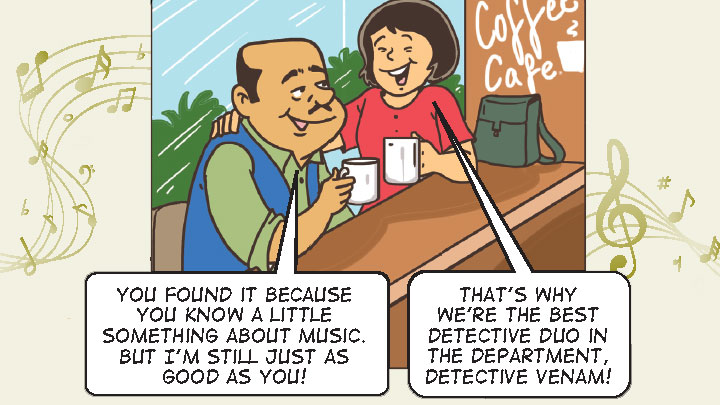 Detective Wanda walked into the music room for the fifth time and looked around with a frown. There were some music sheets strewn on the piano’s sheet music holder. Detective Venam had already gone through them and there was nothing in them, except a few scribbles, some contact numbers, a drawing of a duck and some musical notations. Detective Wanda was about to leave when one sheet caught her eye.